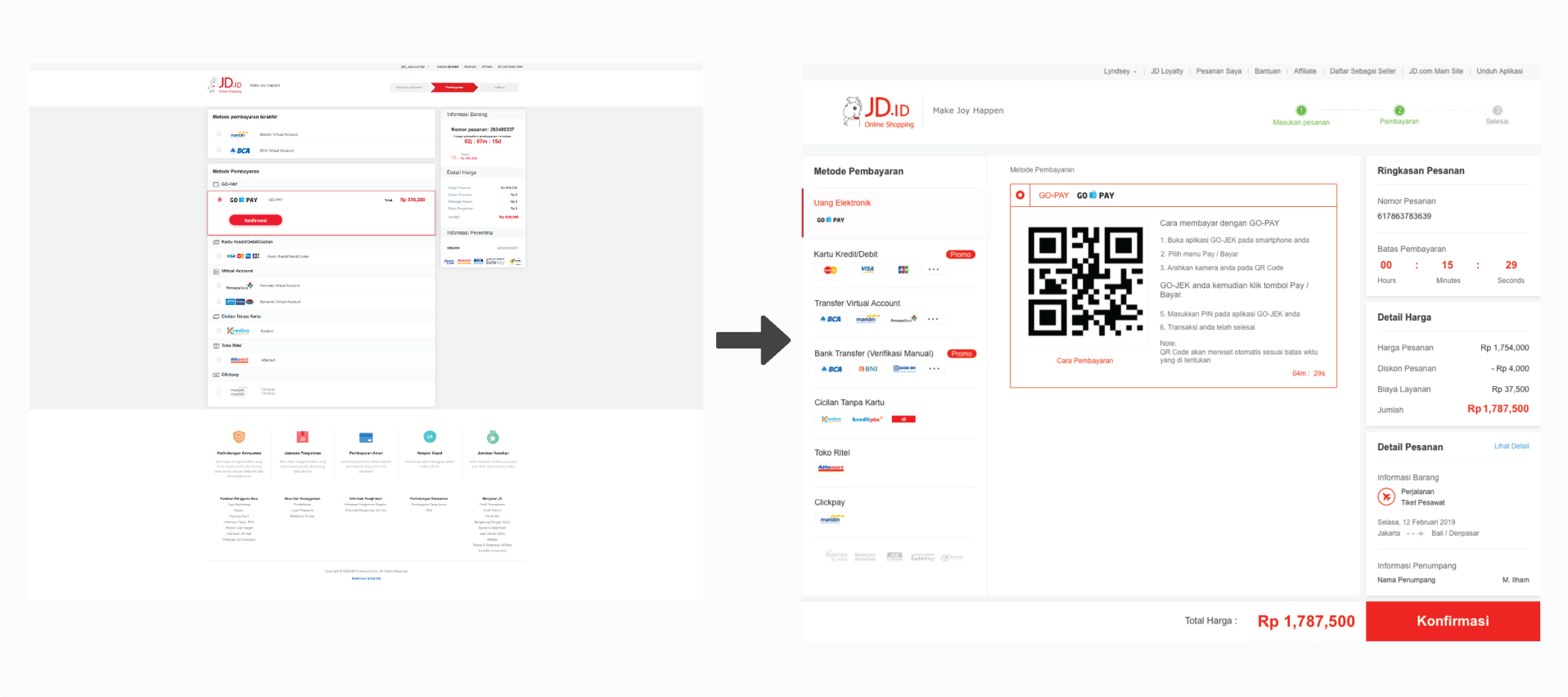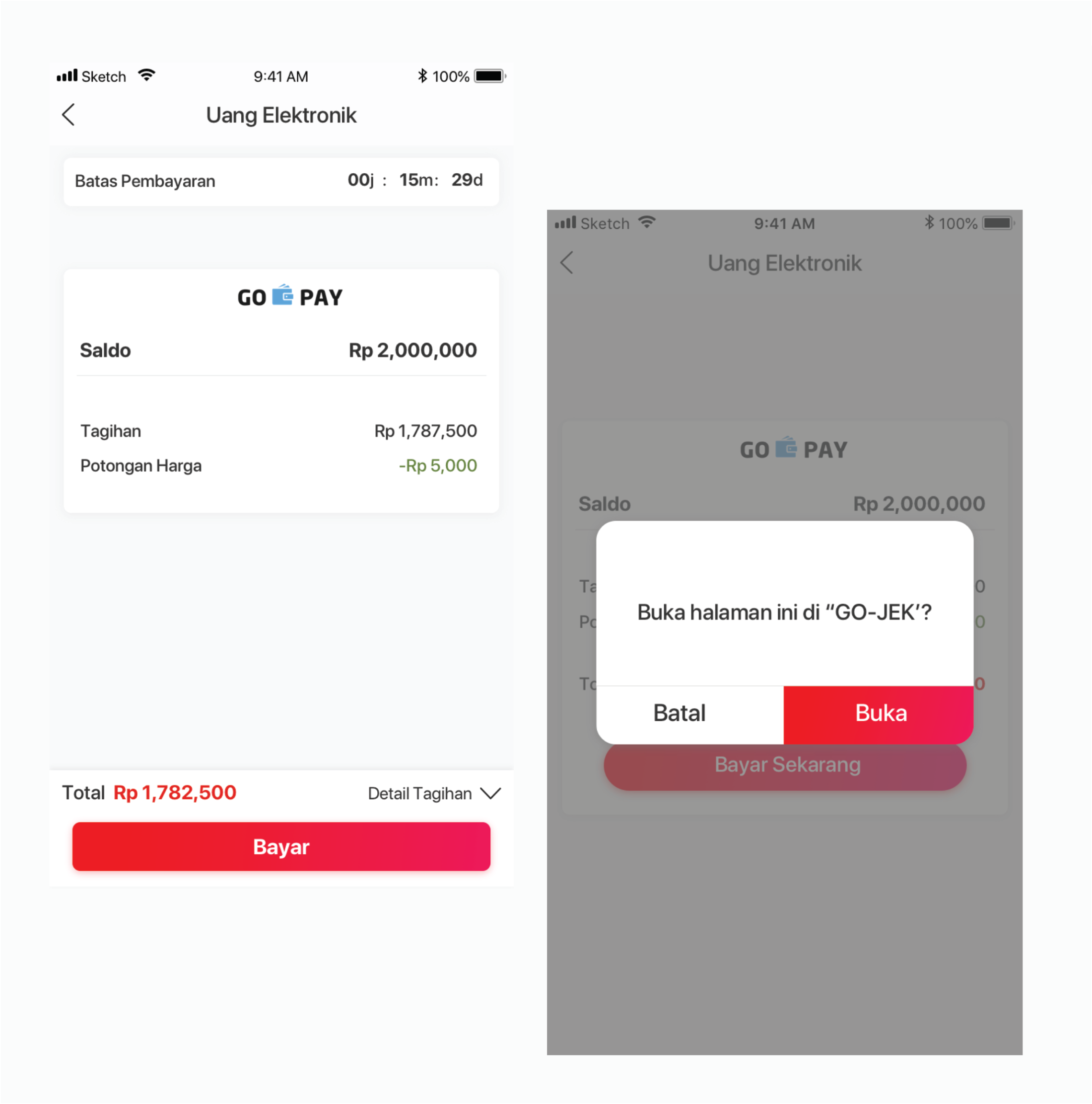 Gopay method will be move to another page and show the detail price with gopay balance. and than if you click a button “bayar” will be show the pop up confirmation.
