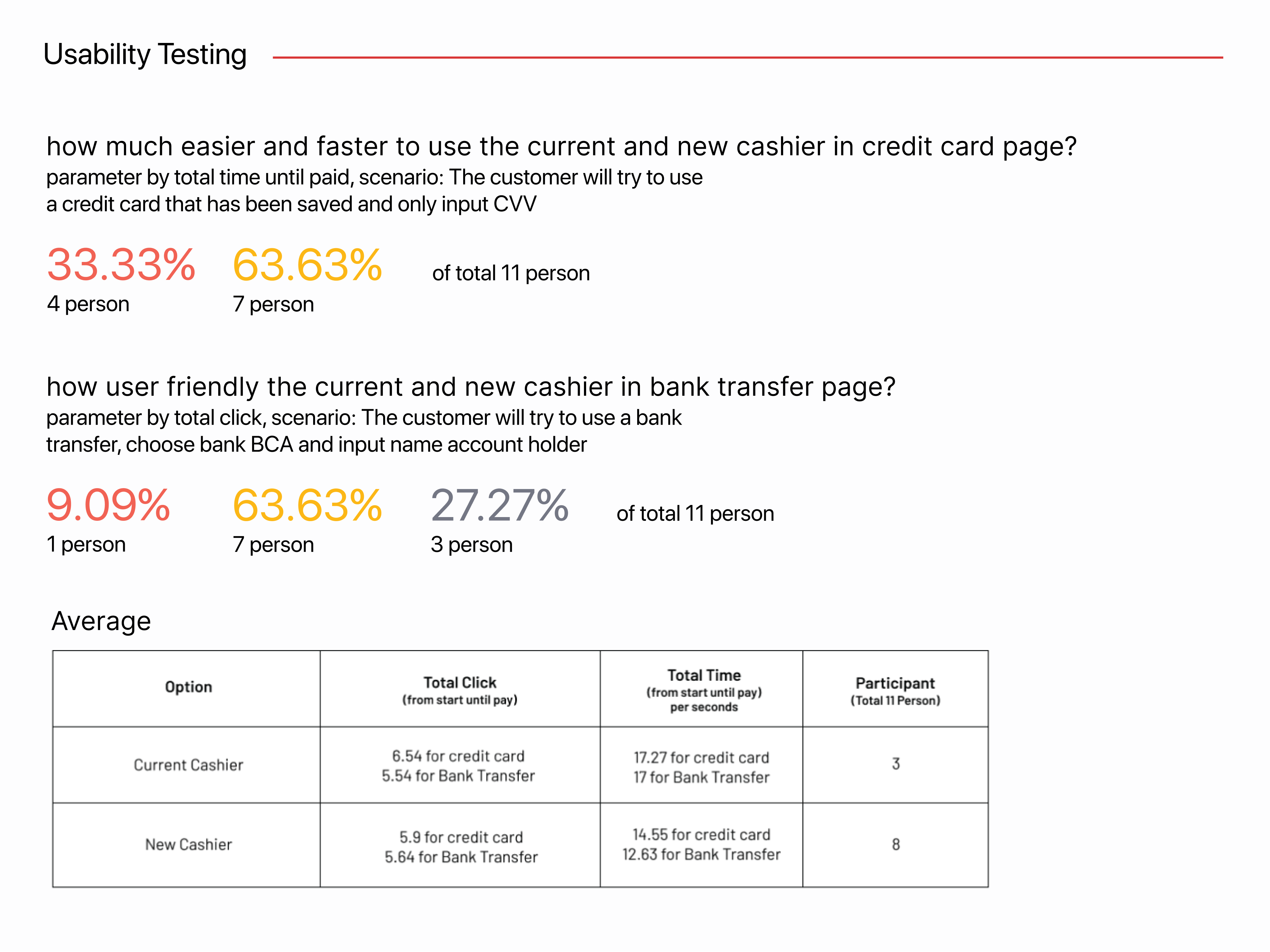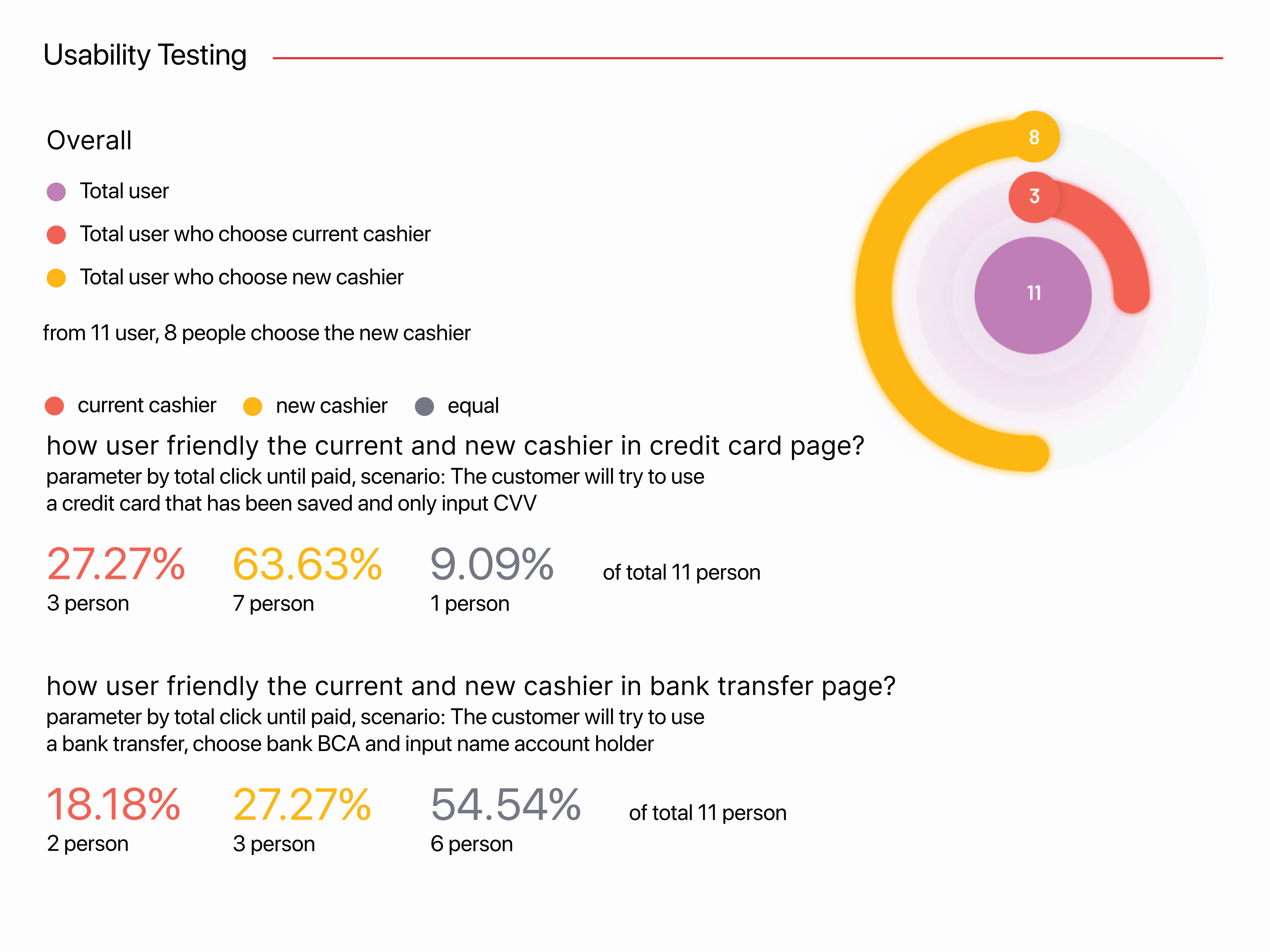 This testing purpose is for find the good solution and the right transformation about revamp. we want to know how user wants, all user want a easy and friendly to use. we should be give to user a good interface and flow. no need faster flow if user not comfortable and and not provide information clearly. and the result from interview randomly user we found the right conclusion. revamp the new layout to be more consistent and more informative. and the new cashier designb have spesification for that