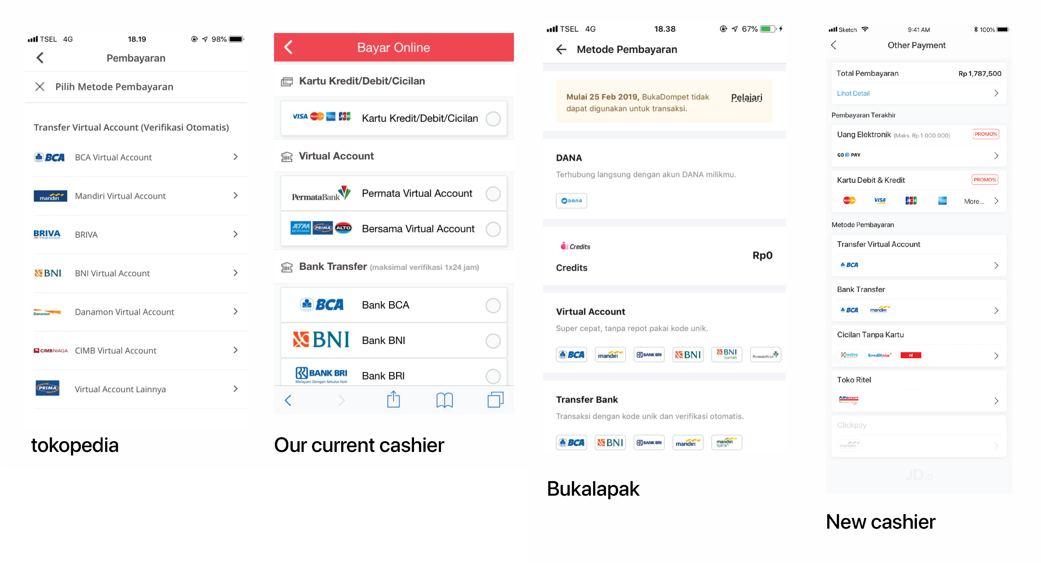 1. The current cashier have a layout similar like tokopedia payment method. show all the payment method and company we provided. we want to change layout similar like bukalapak but more informative and step will be easy to use.