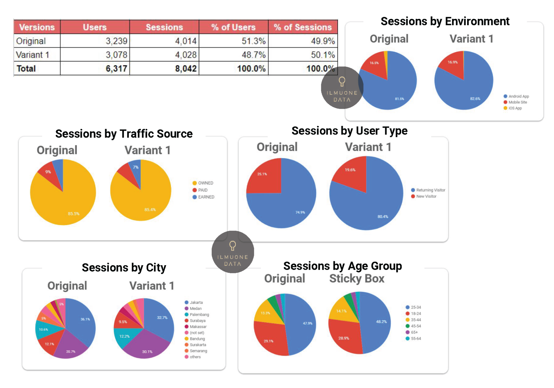 2. The charts shown beside confirm that sessions composition is spread evenly across all traffic sources (Paid, Owned and Earned), as well as cities, age group, returning/new users, and environment for all variants, hence, it is safe to infer that these factors would not affect the engagement metrics and any effect on the metrics will be caused by the experiment.
