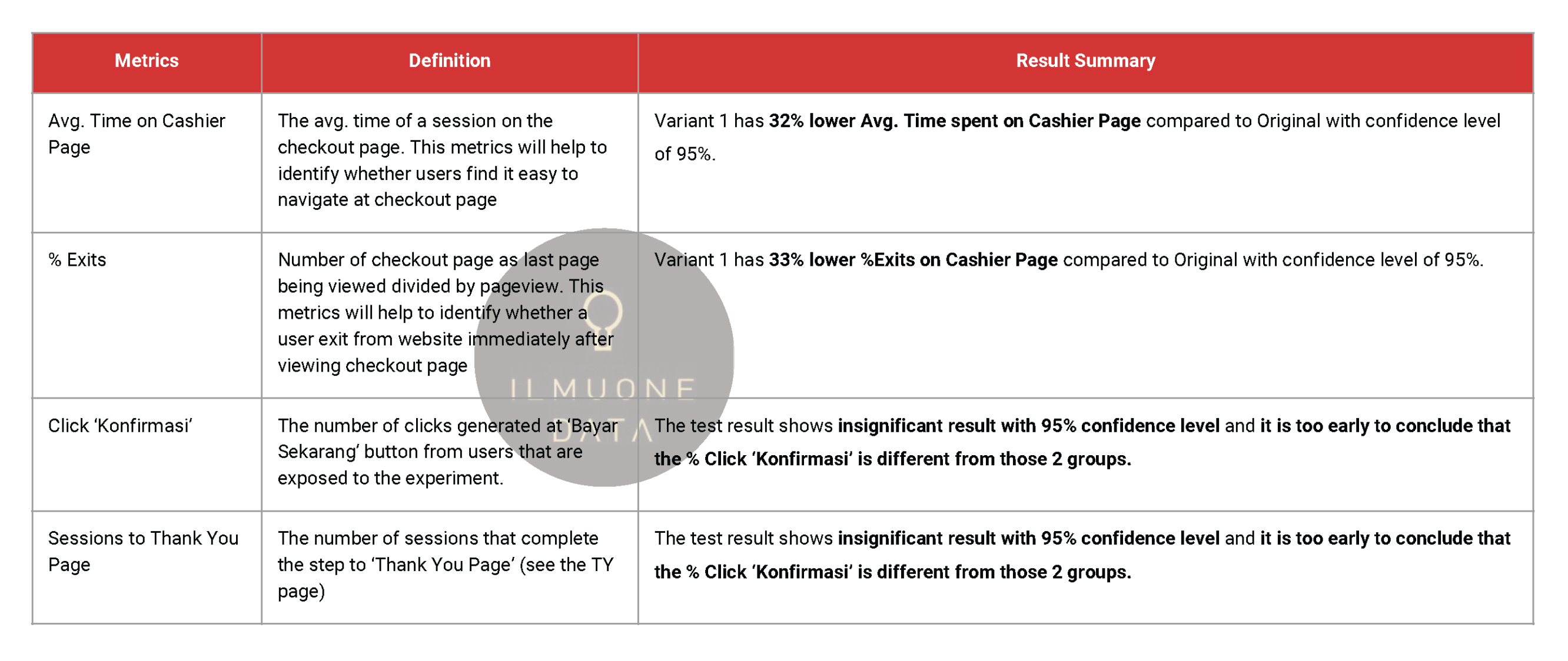 Users that are exposed to ‘Variant 1’ cashier page are more likely to leave the cashier page faster but not leaving the website or app (less avg. time on page and %exits) with 95% confidence interval. However the difference is not significant for %Click ‘Konfirmasi’ and %Sessions to TY Page. This means, users find it easier to navigate by using ‘variant 1’ cashier page but to have different % success rate (click ‘konfirmasi’ or sessions to thank you page) will need more experiment.