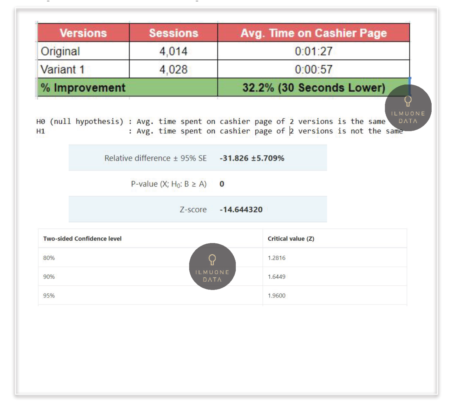 1. Variant 1 has 32% lower Avg. Time spent on Cashier Page compared to Original with confidence level of 95%.