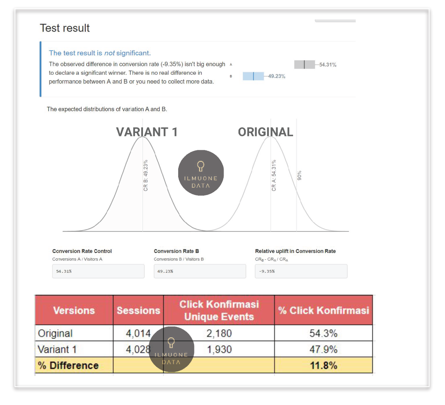 2. The test result shows insignificant result with 95% confidence level even though the % difference is quite big. But due to low sample size, it is too early to conclude that the % Click ‘Konfirmasi’ is different from those 2 groups.
