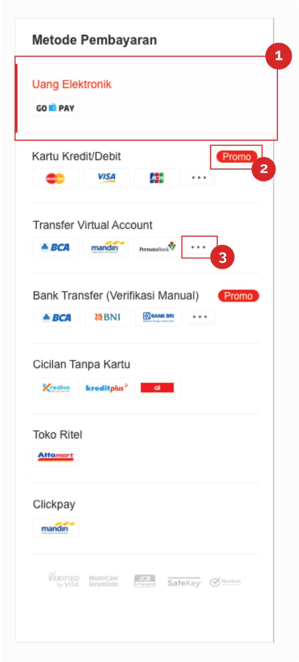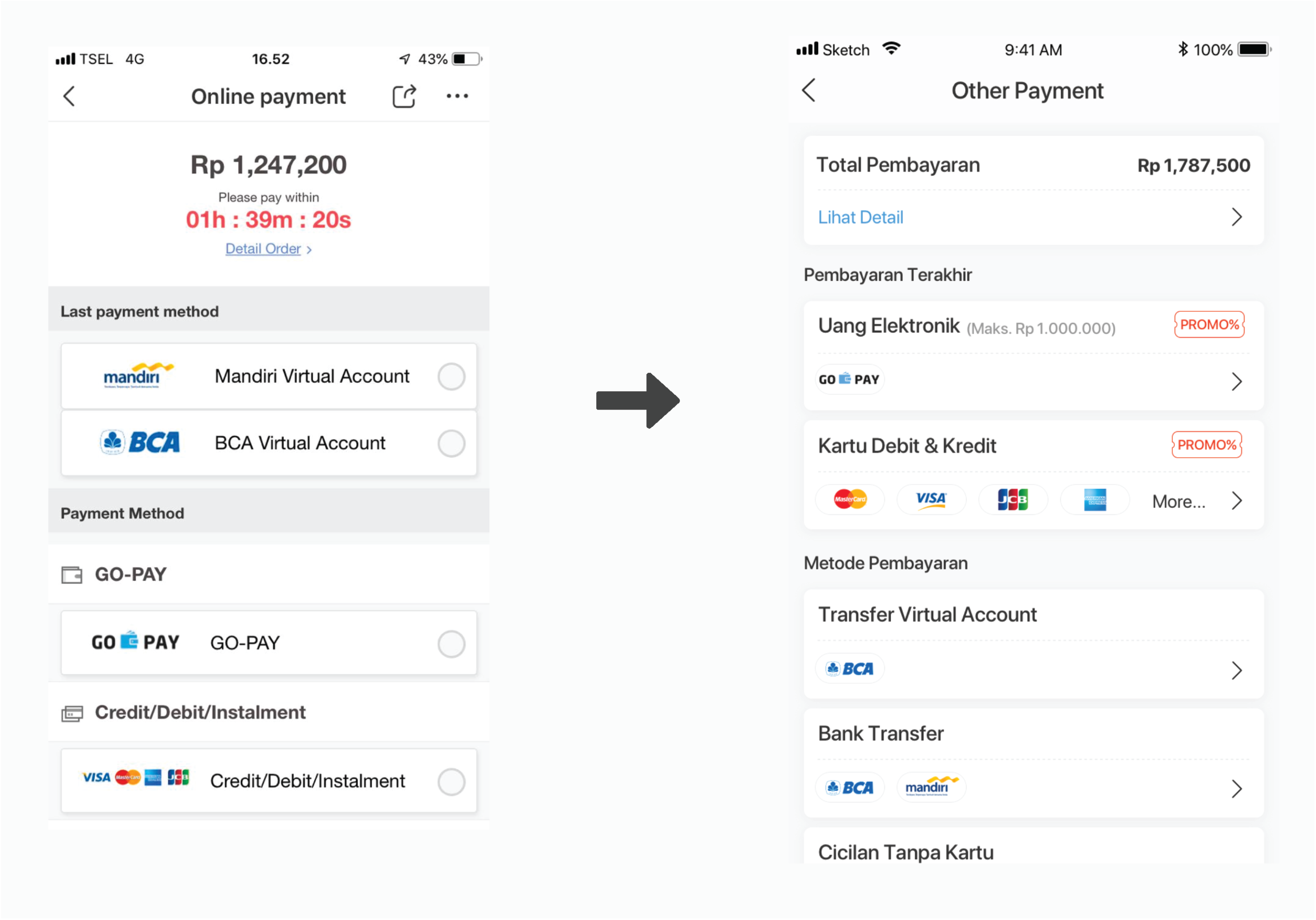 Indonesia has a variety of payment methods, therefore the new UI design is created more categorized (from general to specific payment)