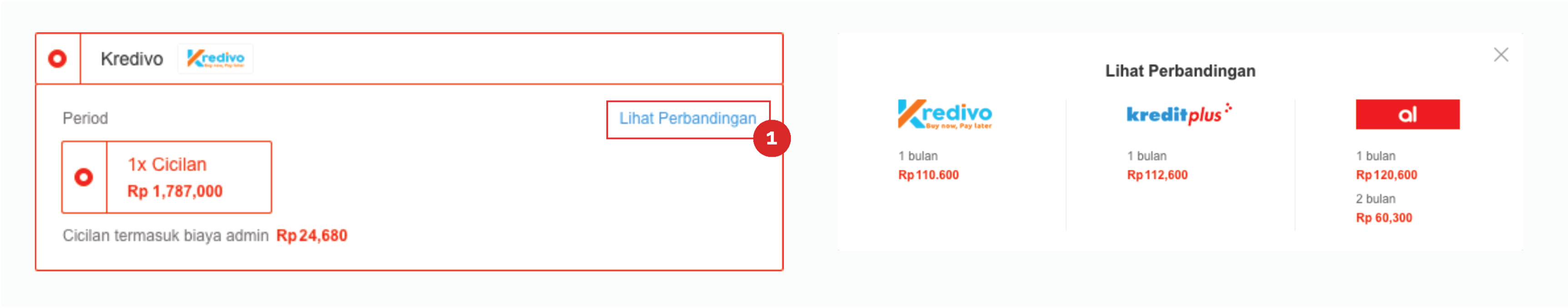 1. “Lihat perbandingan” can be click to show up the pop up and give the information to compare price in provider and another provider